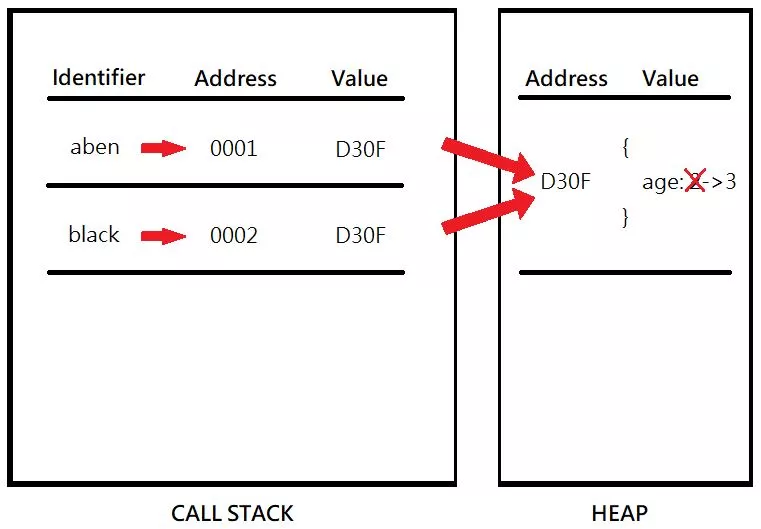 最後 black 物件修改 age 值,因為 black 與 aben 實際上都指向同一物件,所以最終兩者都改為 3。